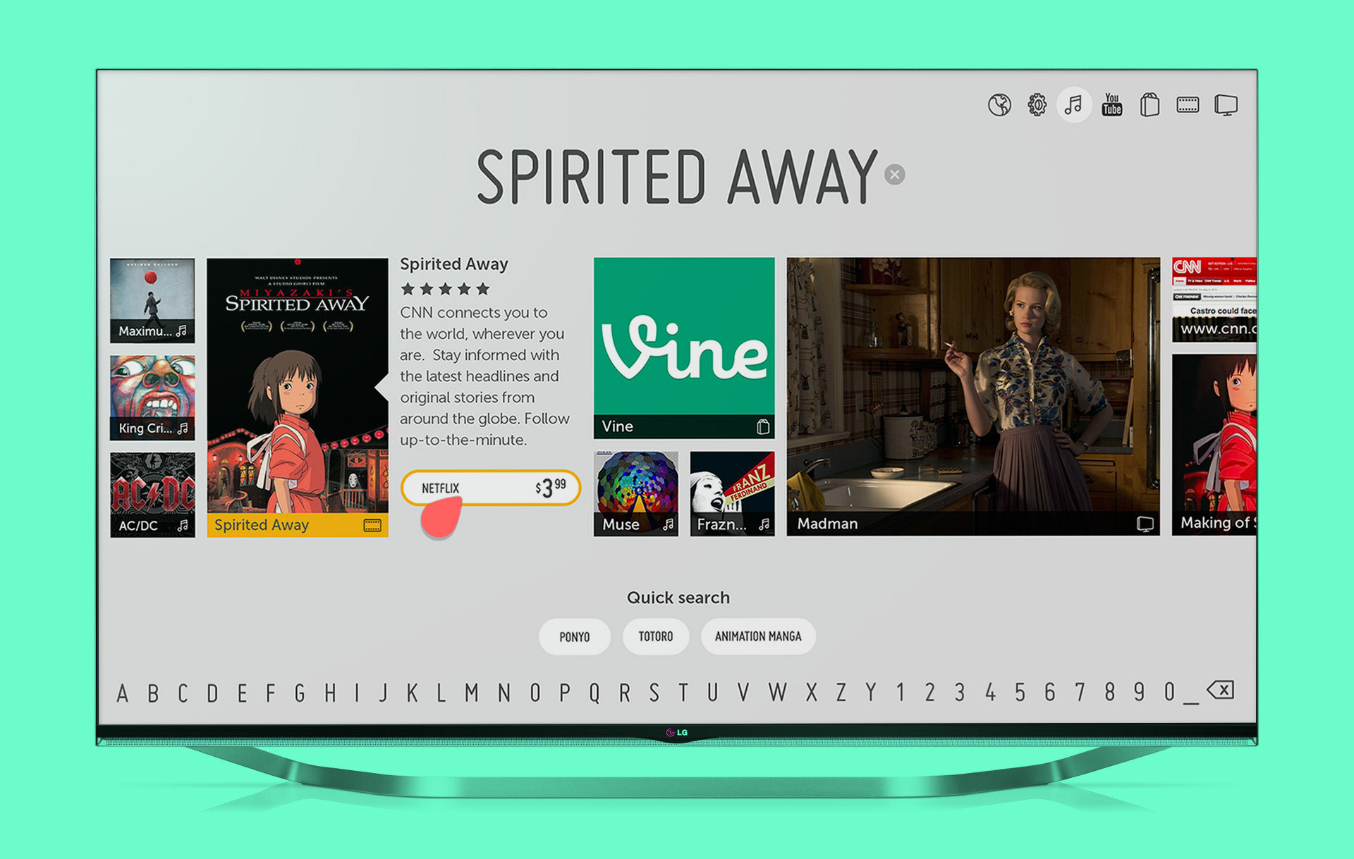 With the mass of content TVs have to offer, and the many different sources that deliver it, we created a design that quickly presents search results in all types of media formats. We decided that the best way to display mass content is by ignoring the source and shifting the focus onto the results themselves. Smartshare was another way to consume media from external devices if they were connected. We developed a grid system where the different sizes represent different types of media–music, movies, etc. The design is modular and dynamic; once you select the type of content you want, the whole thing expands so the user can completely dive in.